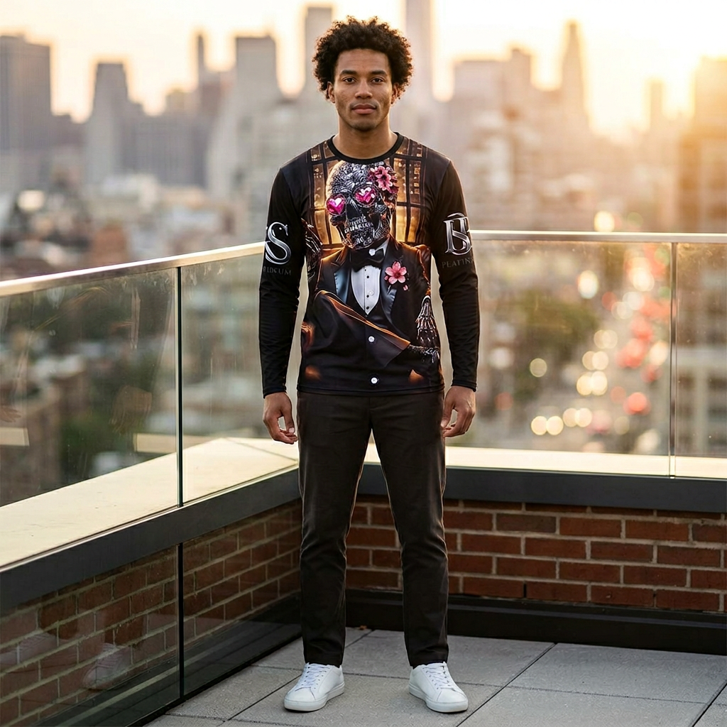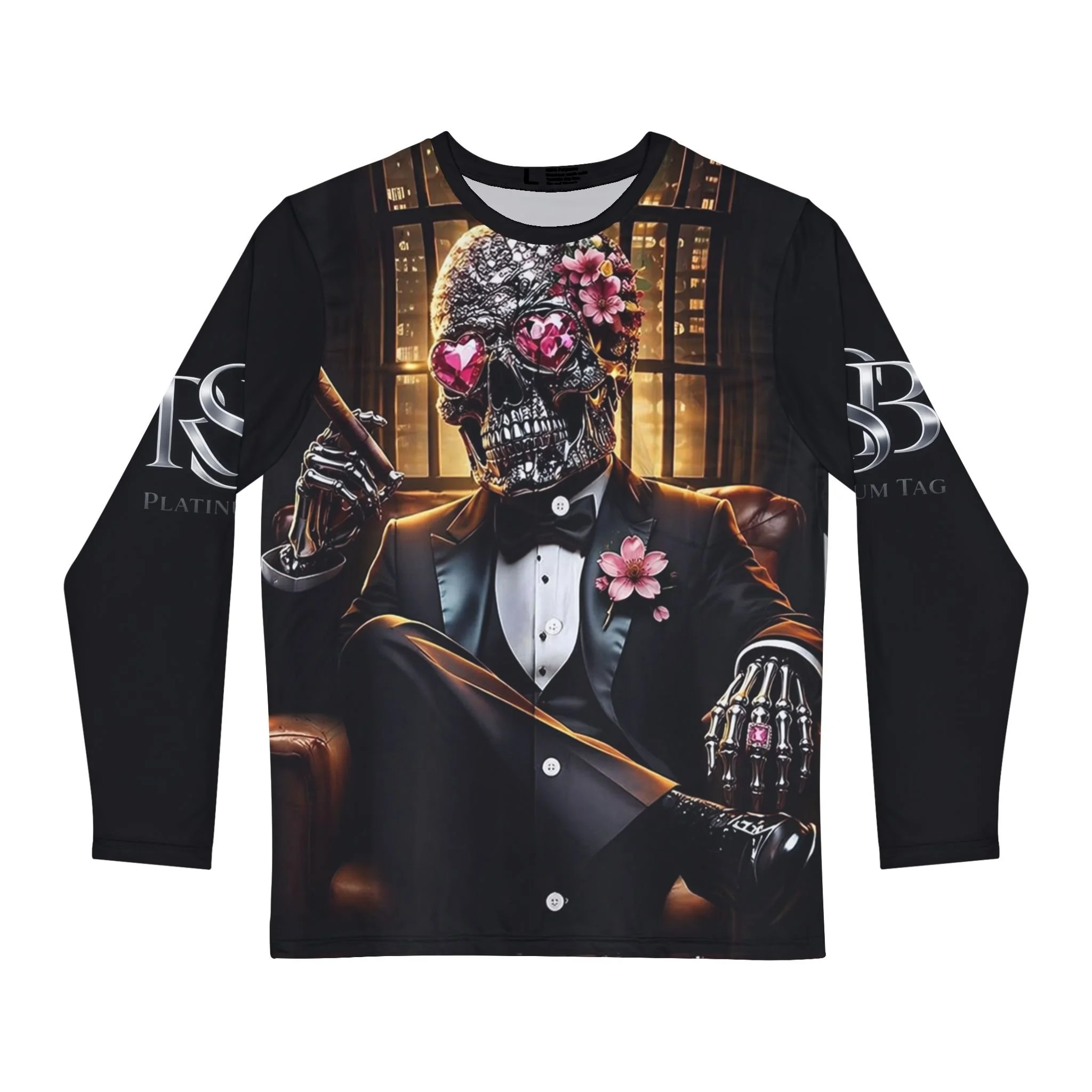 Skull Gentleman Long Sleeve Shirt – Floral Sugar Skull Smoking Tuxedo Design